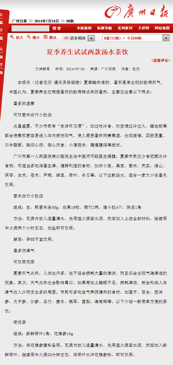 《广州日报》:夏季养生试试两款汤水茶饮 2014年7月24日B08版