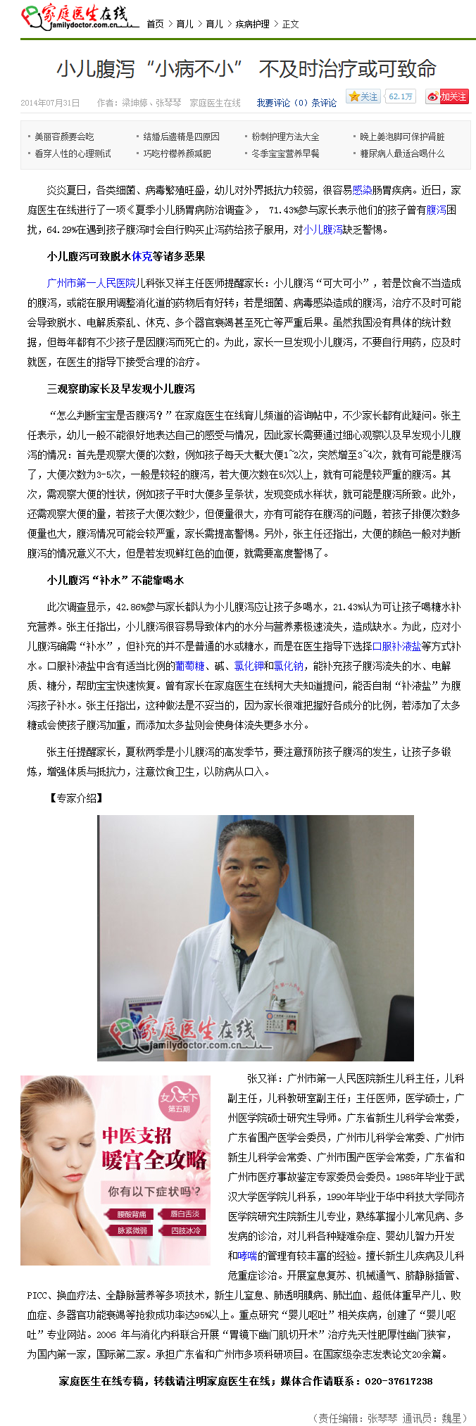 家庭医生在线:小儿腹泻“小病不小” 不及时治疗或可致命 2014年7月31日育儿版