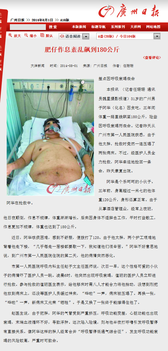 《广州日报》:肥仔作息紊乱飙到180公斤 2014年8月1日A16版
