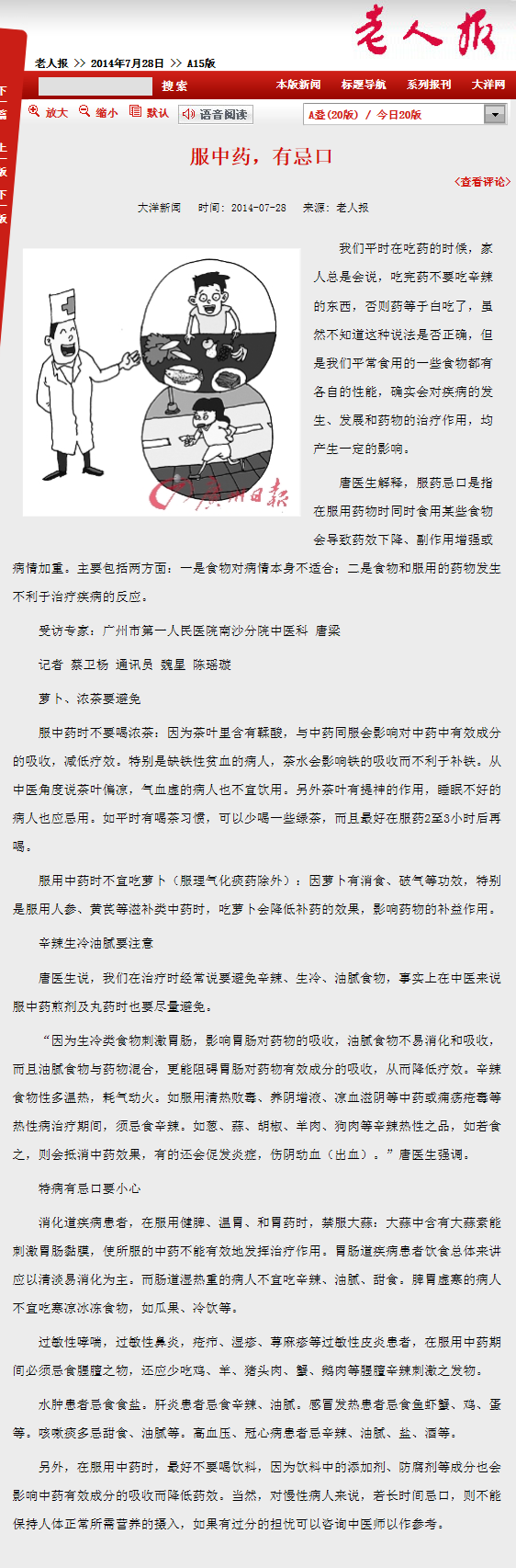 《老人报》:服中药 有忌口 2014年7月28日A15版