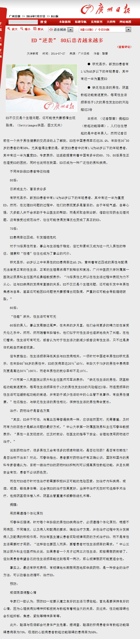 《广州日报》:ED“逆袭” 80后患者越来越多 2014年7月27日B11版