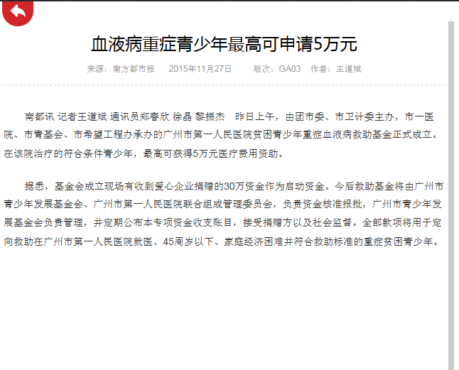 《南方都市报》:血液重症青少年最高可申请5万元 2015年11月27日GA03版