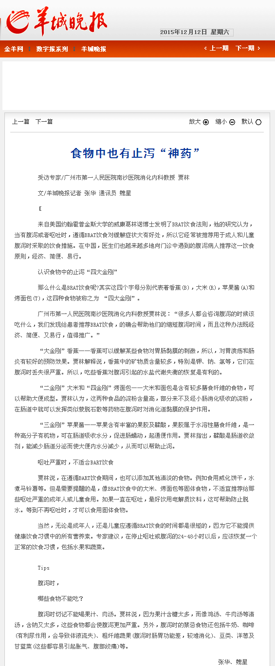 《羊城晚报》:食物中也有“止泻”神药 2015年12月12日 B08版