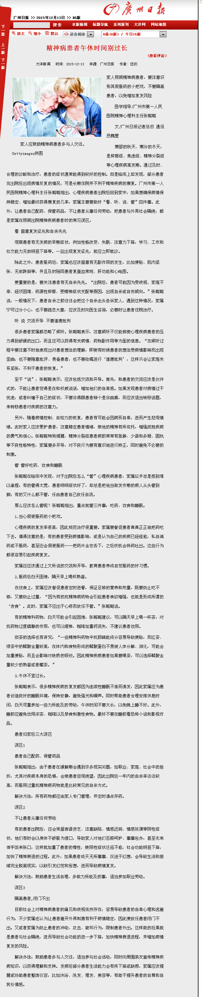《广州日报》:精神病患者午休时间别过长 2015年12月13日 B6版