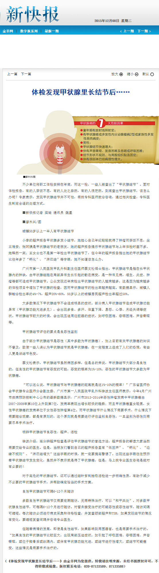 《新快报》:体检发现甲状腺里长结节后…… 2015年12月8日B07版