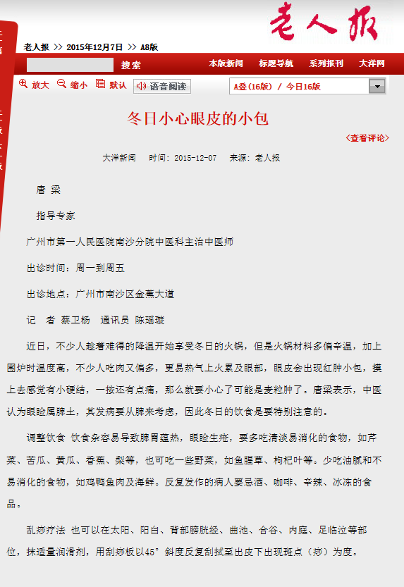 《老人报》:冬日小心眼皮的小包 2015年12月7日A08版