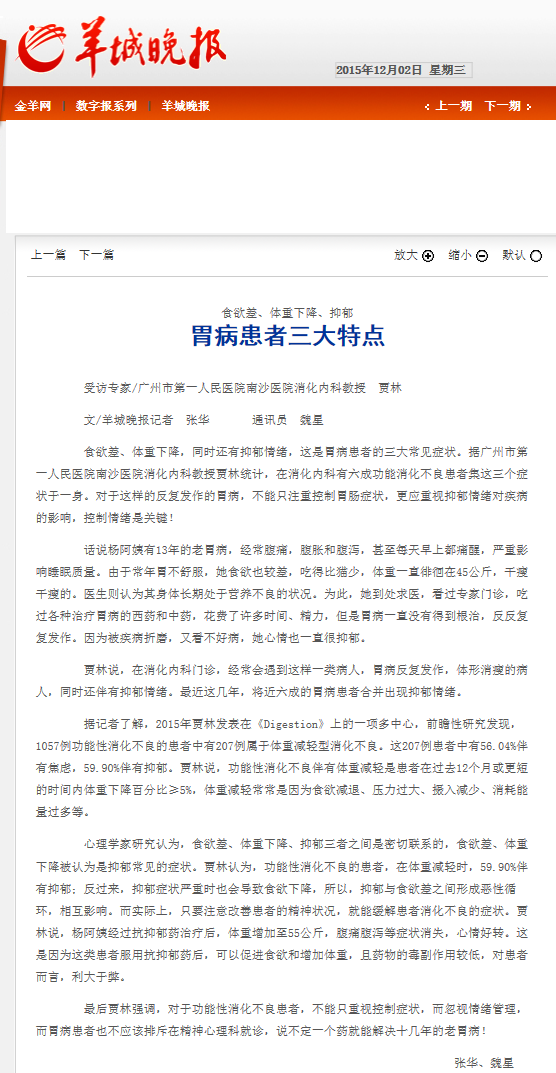 《羊城晚报》:胃病患者三大特点 2015年12月2日A20版