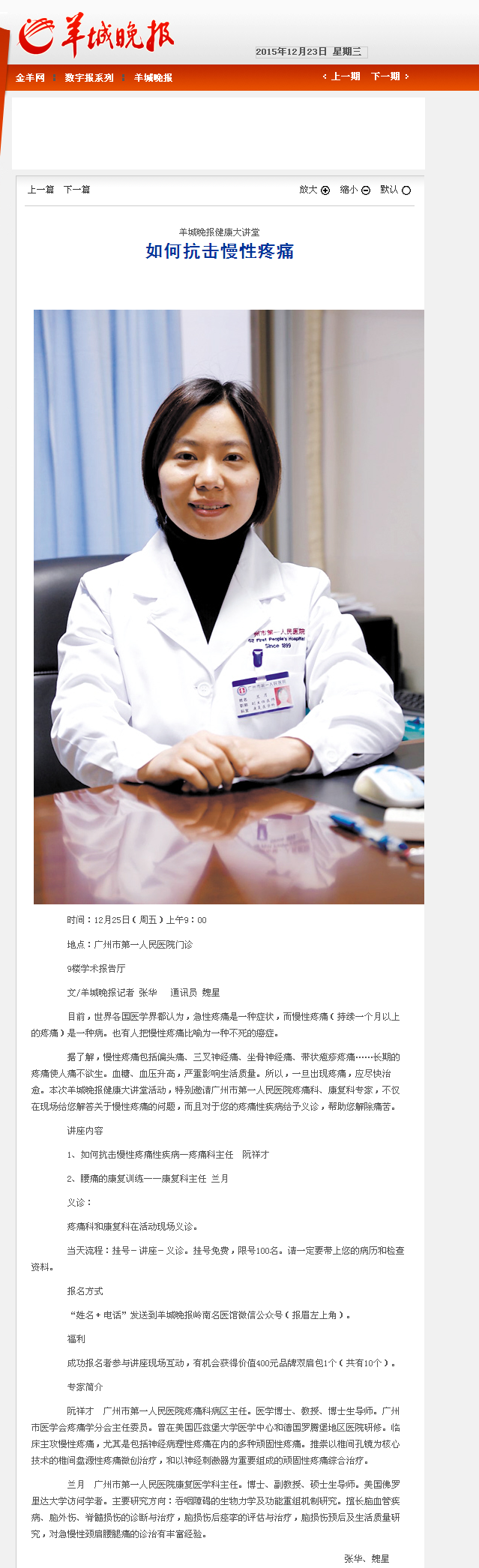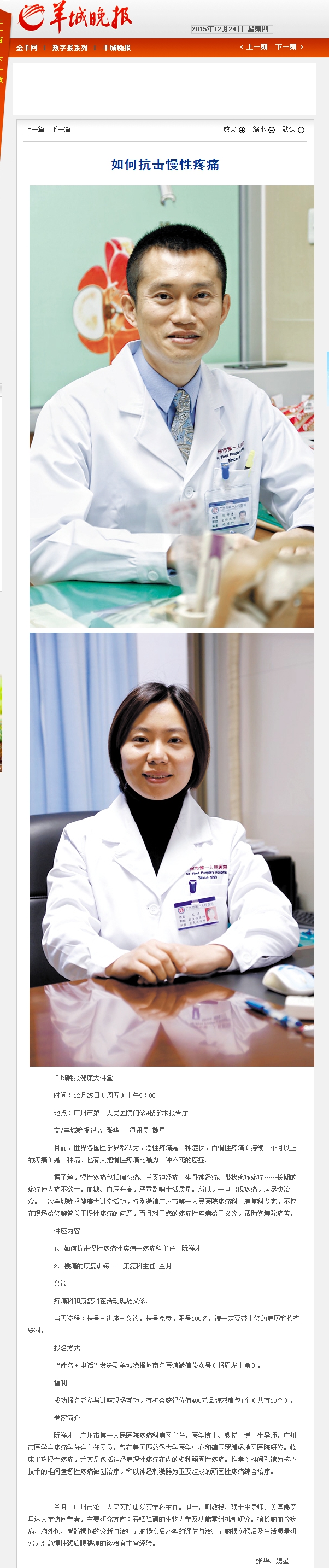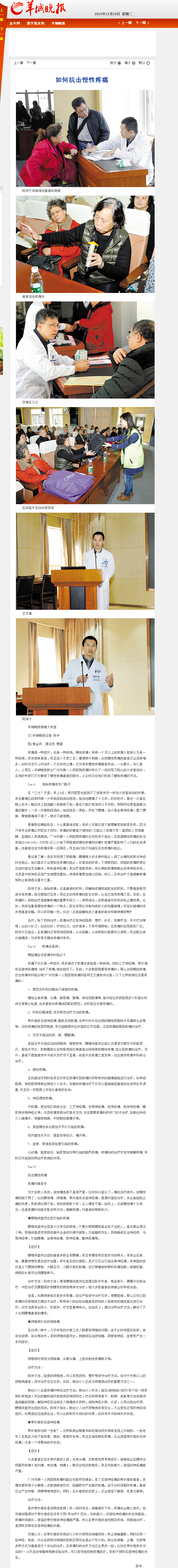 《羊城晚报》:如何抗击慢性疼痛 2015年12月23日 A20版