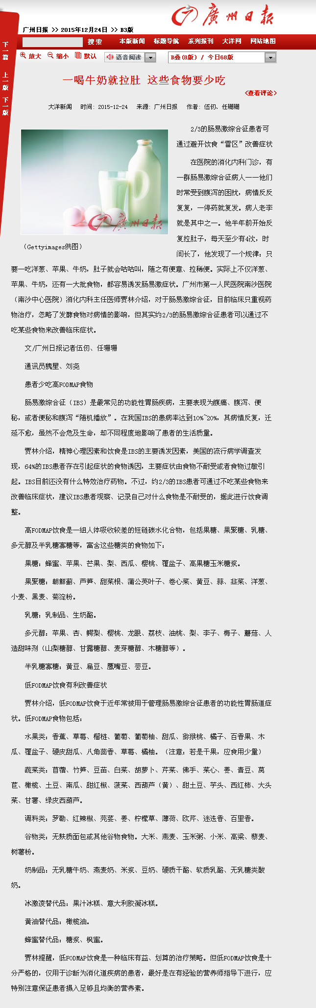 《广州日报》:一喝牛奶就拉肚 这些食物要少吃 2015年12月24日 B3版