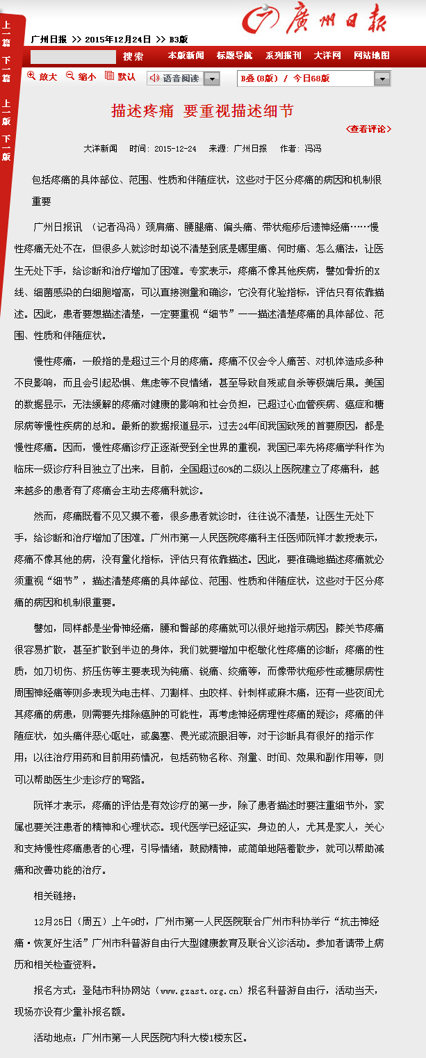 《广州日报》:描述疼痛 要重视描述细节 2015年12月24日 B3版