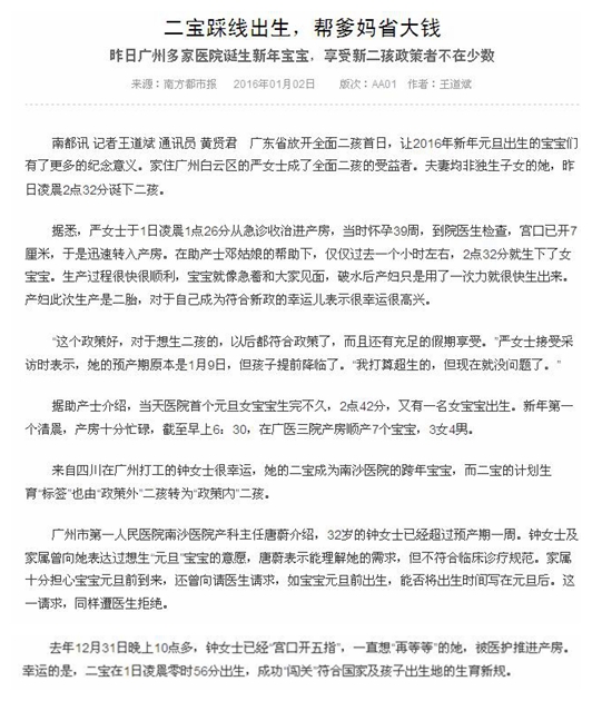 《南方都市报》:二宝踩线出生,帮爹妈省大钱 2016年1月2日 AA01版