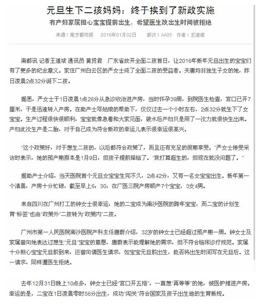 《南方都市报》:元旦生下二孩妈妈:终于挨到了新政实施 2016年1月2日 AA05版