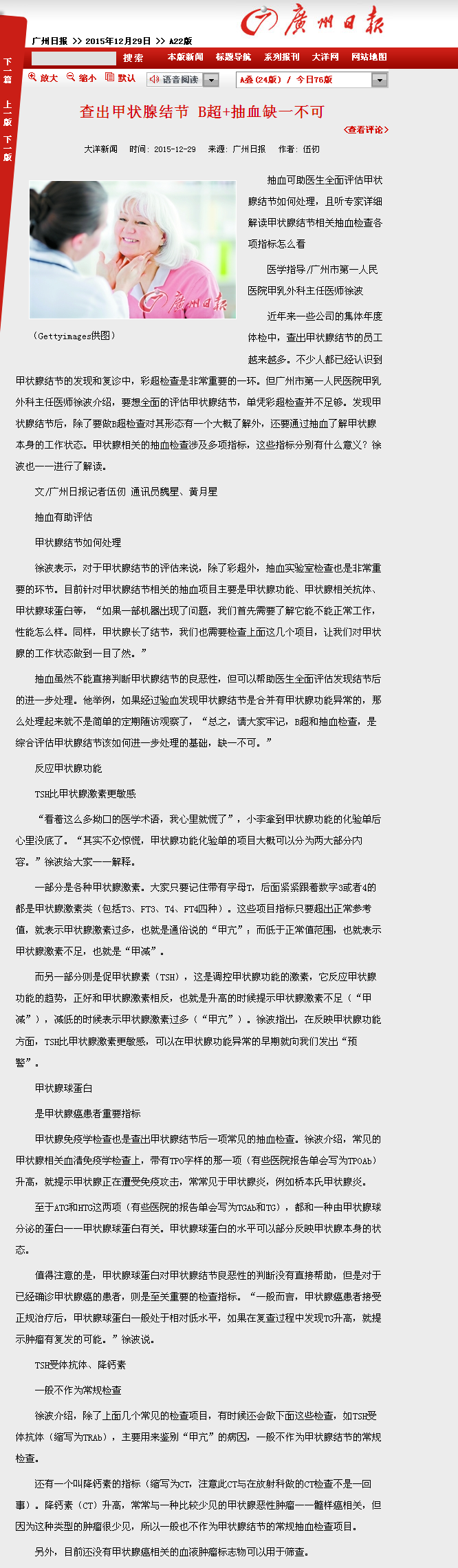 《广州日报》:查出甲状腺结节 B超+抽血缺一不可 2015年12月29日 A22版