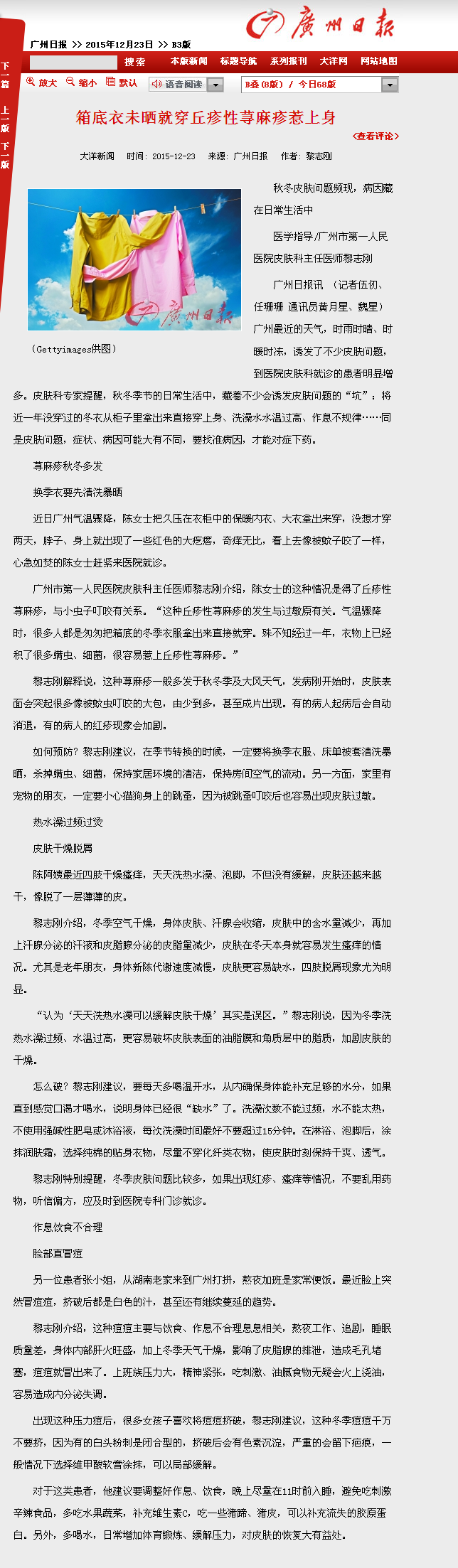 《广州日报》:箱底衣未晒就穿 丘疹性荨麻疹惹上身 2015年12月23日 B3版