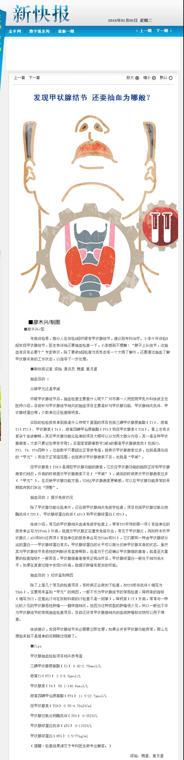 《新快报》:发现甲状腺结节 还要抽血为哪般?2016年1月5日 B06版