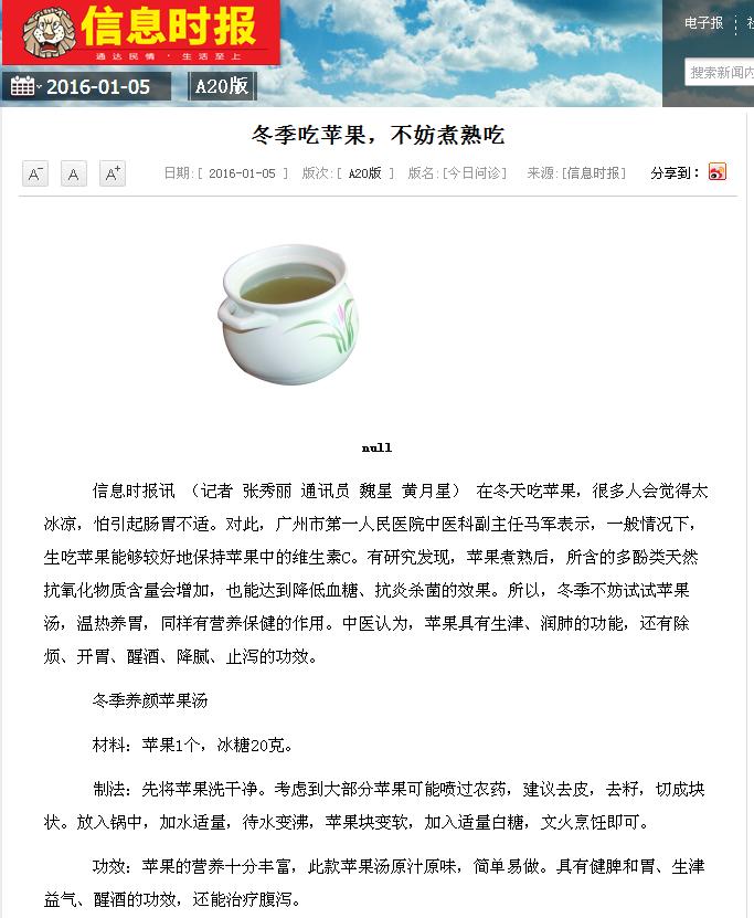 《信息时报》:冬季吃苹果,不妨煮熟吃 2016年1月5日 A20版