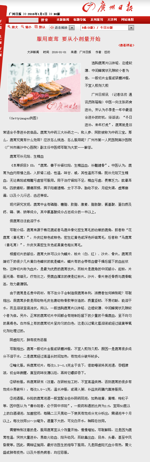 《广州日报》:服用鹿茸 要从小剂量开始 2016年1月1日 B8版