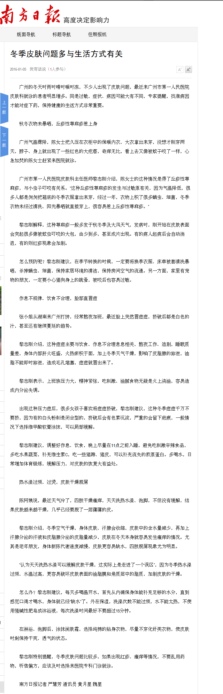 《南方日报》:冬季皮肤问题多 与生活方式有关 2016年1月5日 B04版