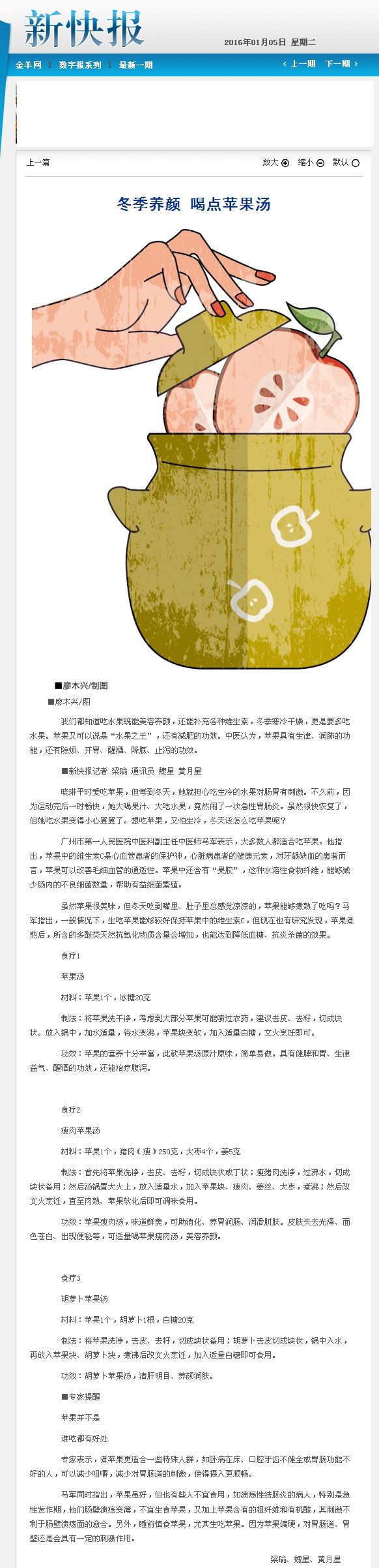 《新快报》:冬季养颜 喝点苹果汤 2016年1月5日 B8版