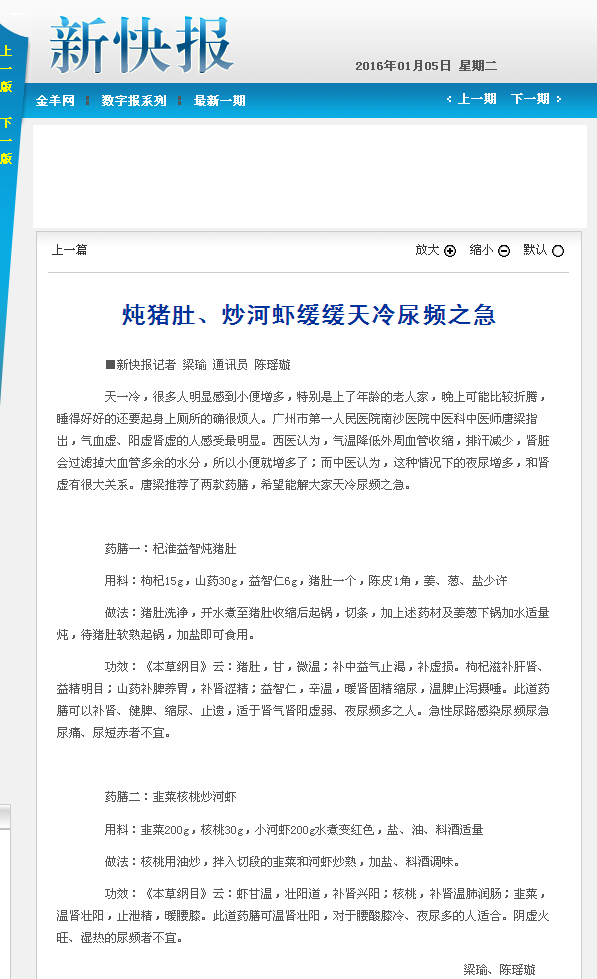 《新快报》:炖猪肚、炒河虾 缓缓天冷尿频之急 2016年1月5日 B06版