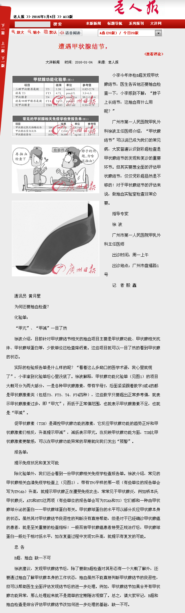 《老人报》:遭遇甲状腺结节,为何还要抽血? 2016年1月4日 A13版