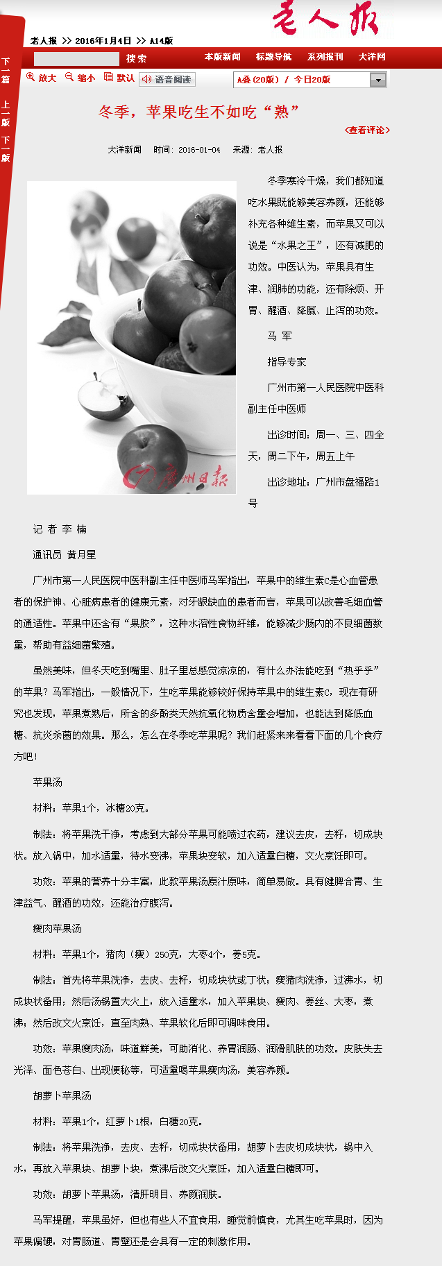 《老人报》:冬季,苹果吃生不如吃“熟” 2016年1月4日 A14版