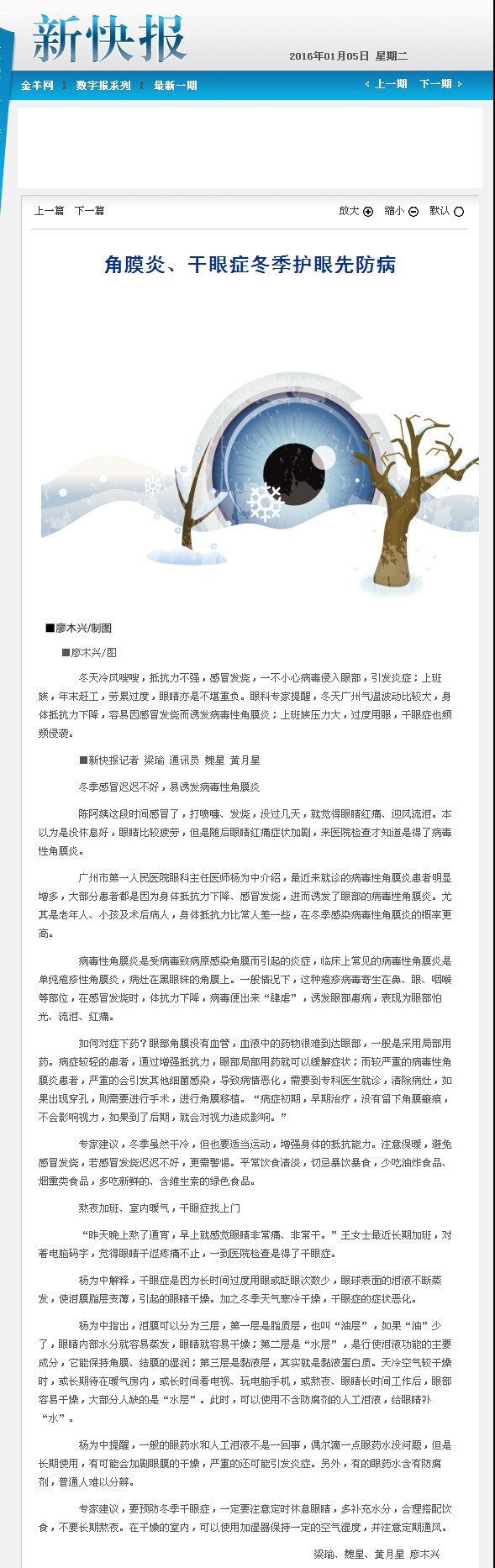 《新快报》:角膜炎、干眼症 冬季护眼先防病 2016年1月5日 B02版