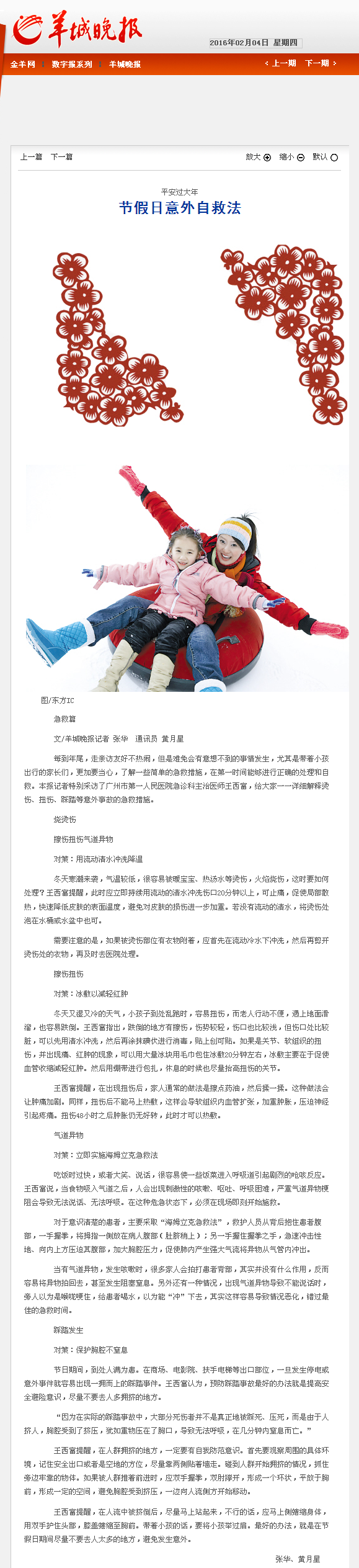 《羊城晚报》:节假日意外自救法 2016年2月4日 A16版