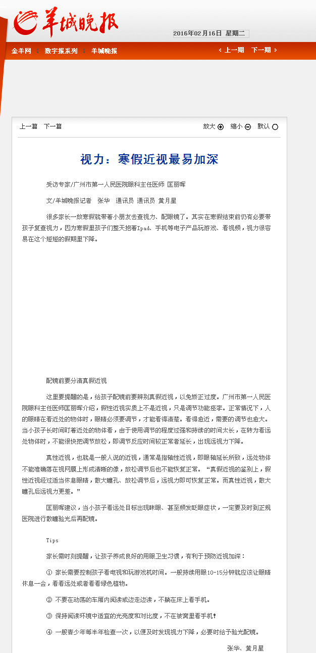 《羊城晚报》:视力:寒假近视最易加深 2016年2月16日B05