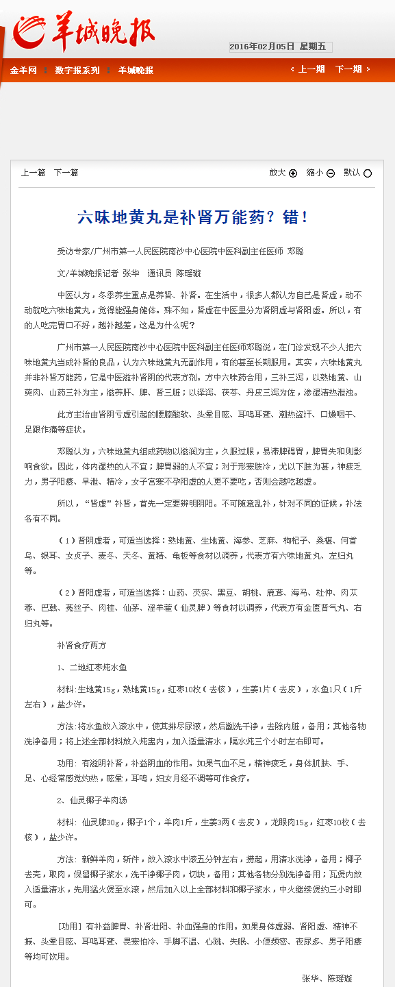 《羊城晚报》:六味地黄丸是补肾万能药?错!2016年2月5日A16版