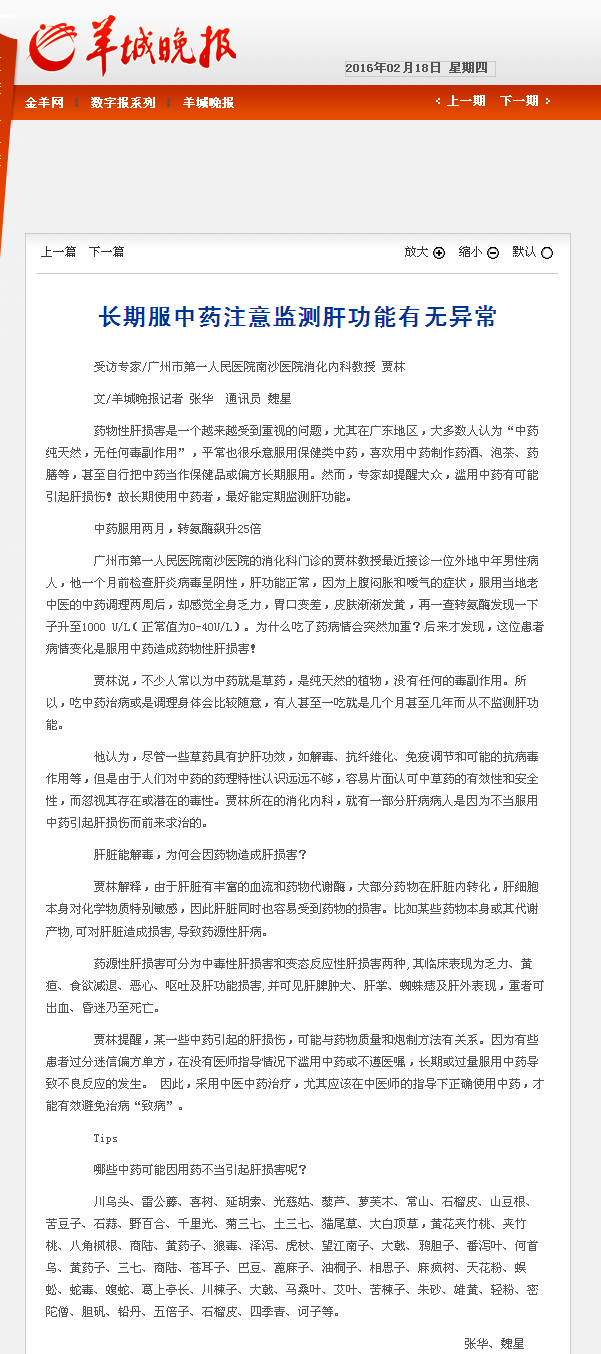 《羊城晚报》:长期服中药注意监测肝功能有无异常 2016年2月18日A20版