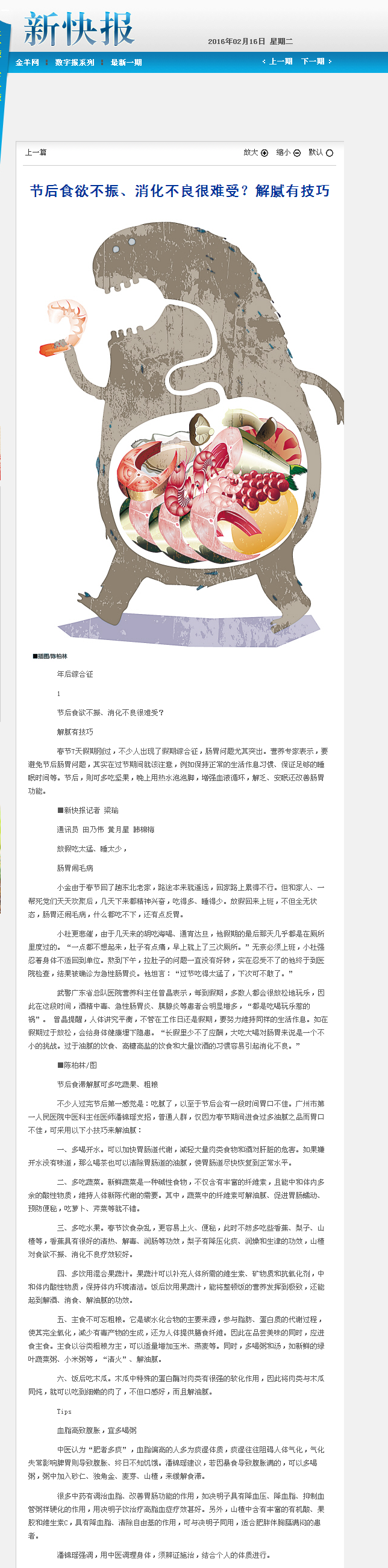 《新快报》:节后食欲不振、消化不良很难受?解腻有技巧 2016年2月16日B01