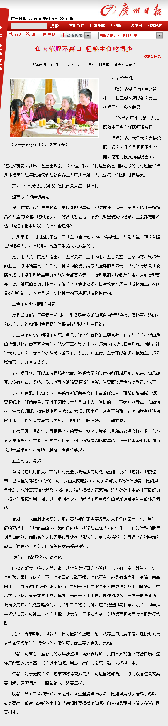 《广州日报》:鱼肉荤腥不离口 粗粮主食吃得少 2016年2月4日B3版