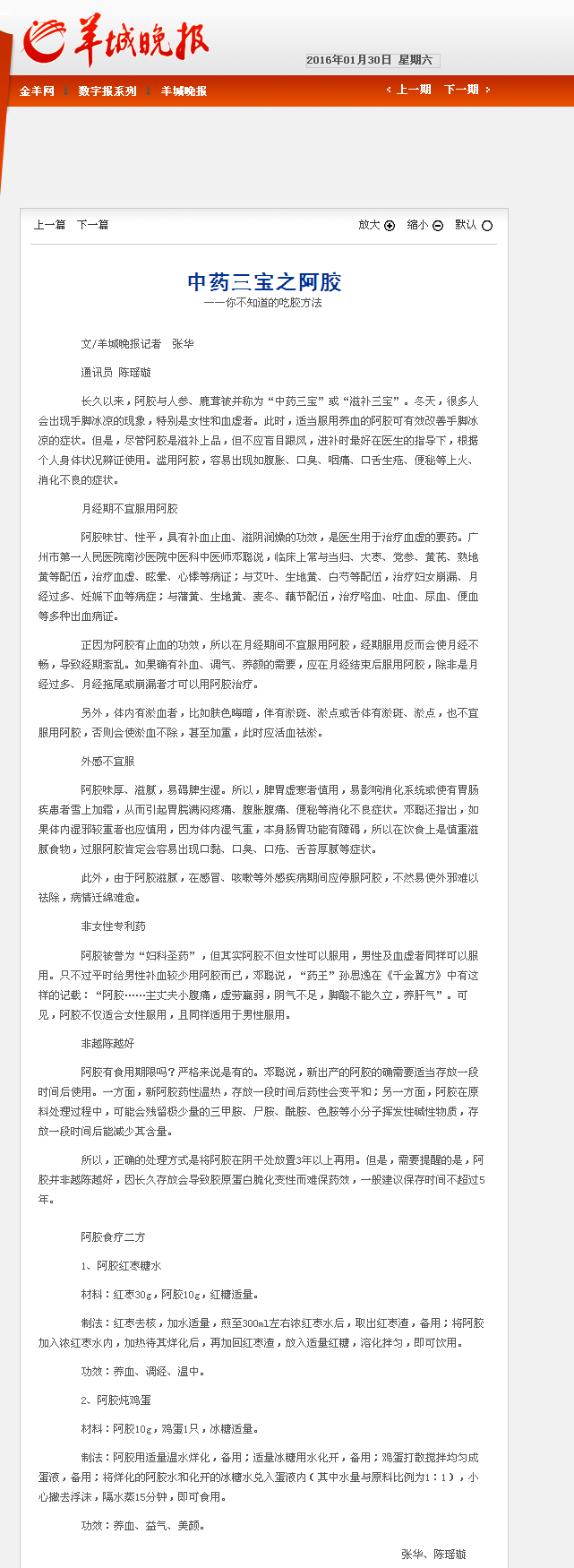 《羊城晚报》:中药三宝之阿胶 2016年1月30日 B08版