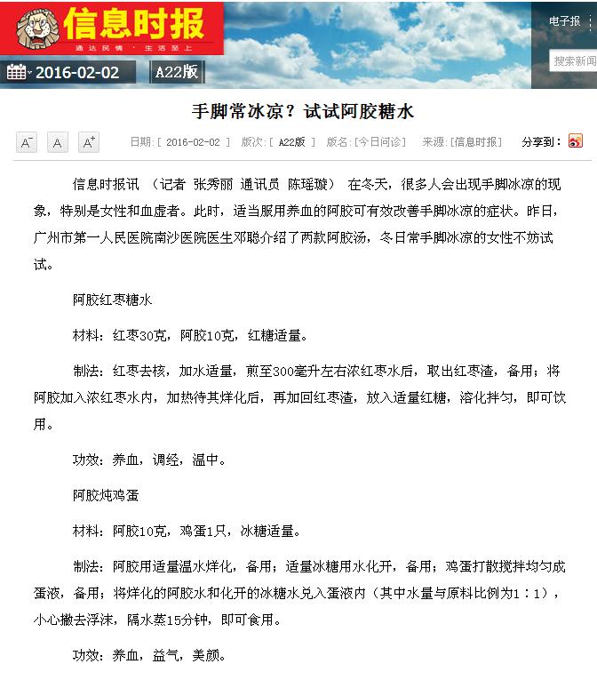 《信息时报》:手脚常冰凉?试试阿胶糖水 2016年2月2日 A22版