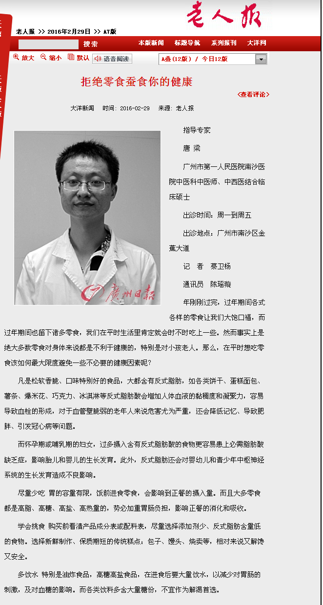 《老人报》:拒绝零食蚕食你的健康 2016年2月29日A7版