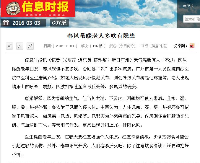 《信息时报》:春风虽暖老人多吹有隐患 2016年3月3日C07版