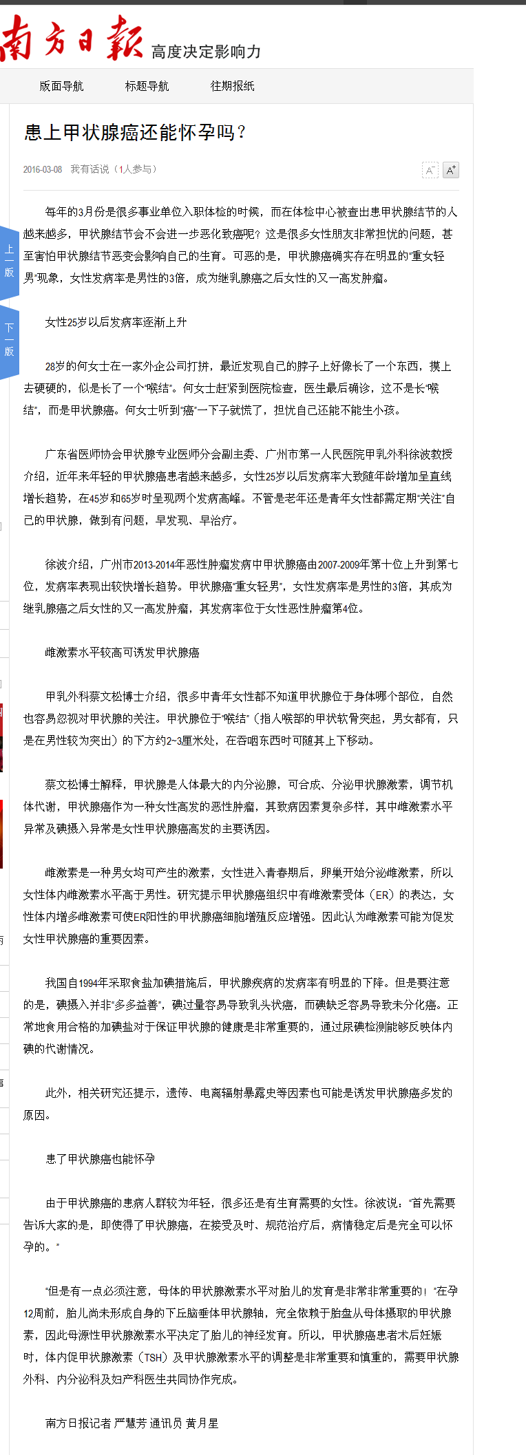 《南方日报》患上甲状腺癌还能怀孕吗? 2016年3月8日B04版