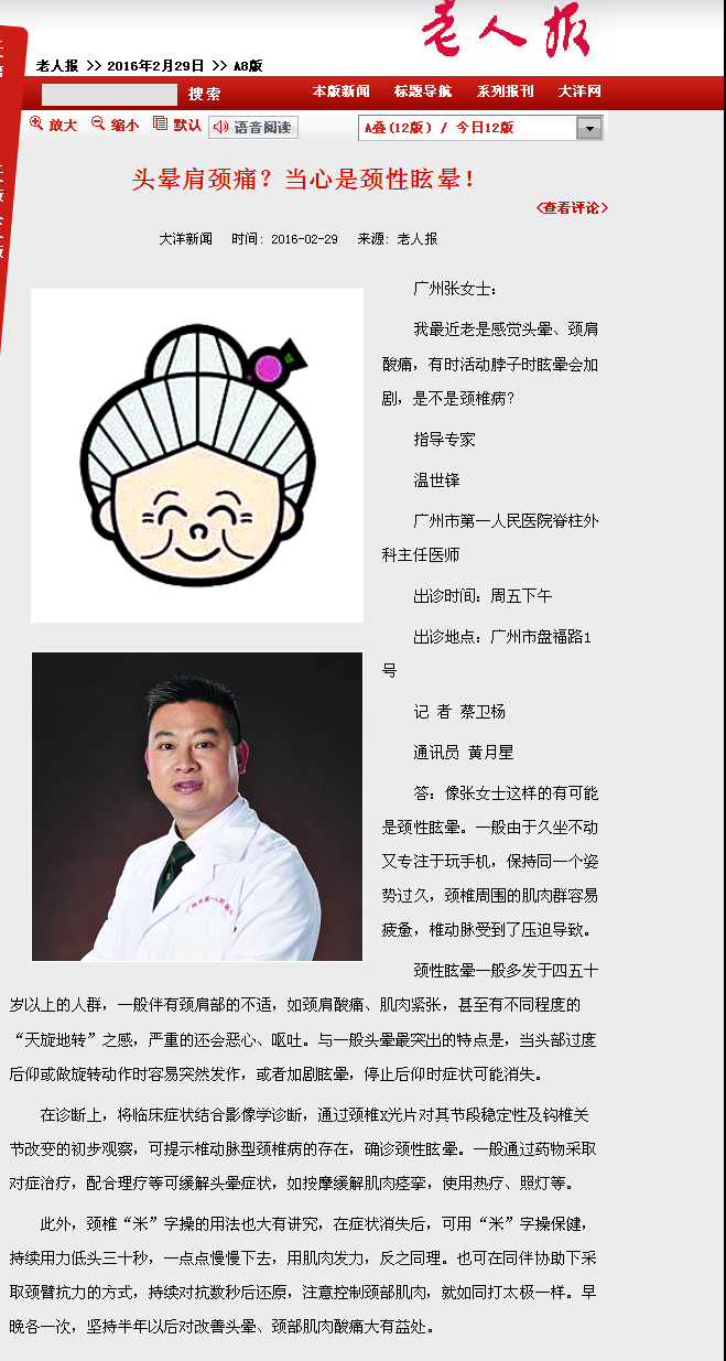 《老人报》:头晕肩颈痛?当心是颈性眩晕!2016年2月29日A8版
