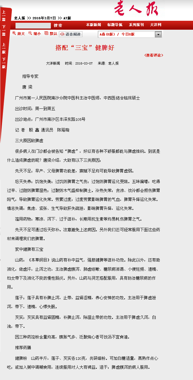 《老人报》:搭配“三宝”健脾好 2016年3月7日A7版