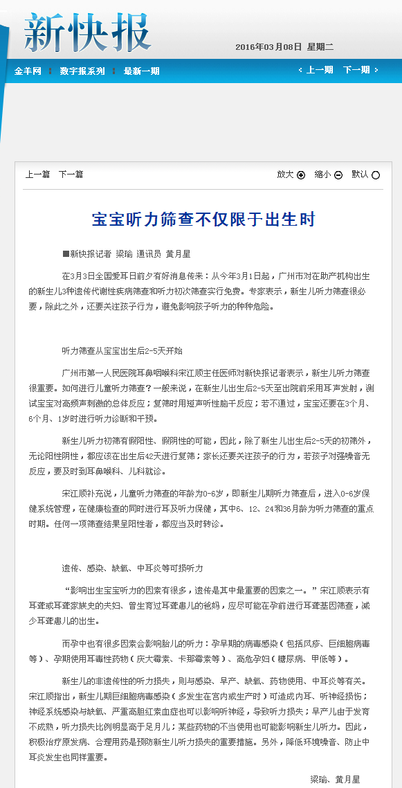 《新快报》:宝宝听力筛查不仅限于出生时 2016年3月8日B06版