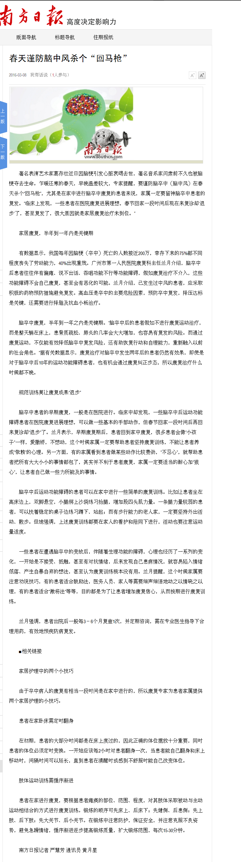 《南方日报》:春天谨防脑中风杀个“回马枪” 2016年3月8日B04版