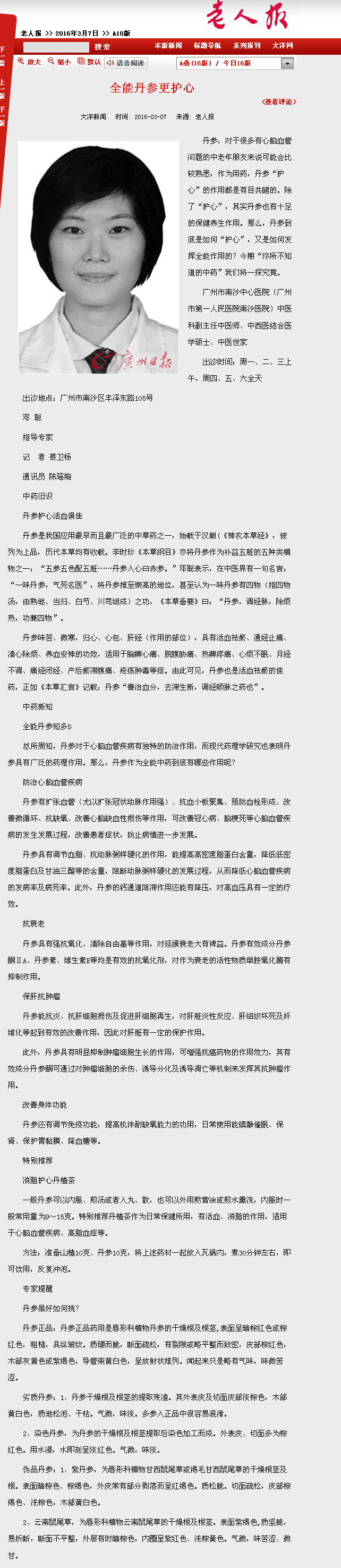 《老人报》:全能丹参更护心 2016年3月7日A10版