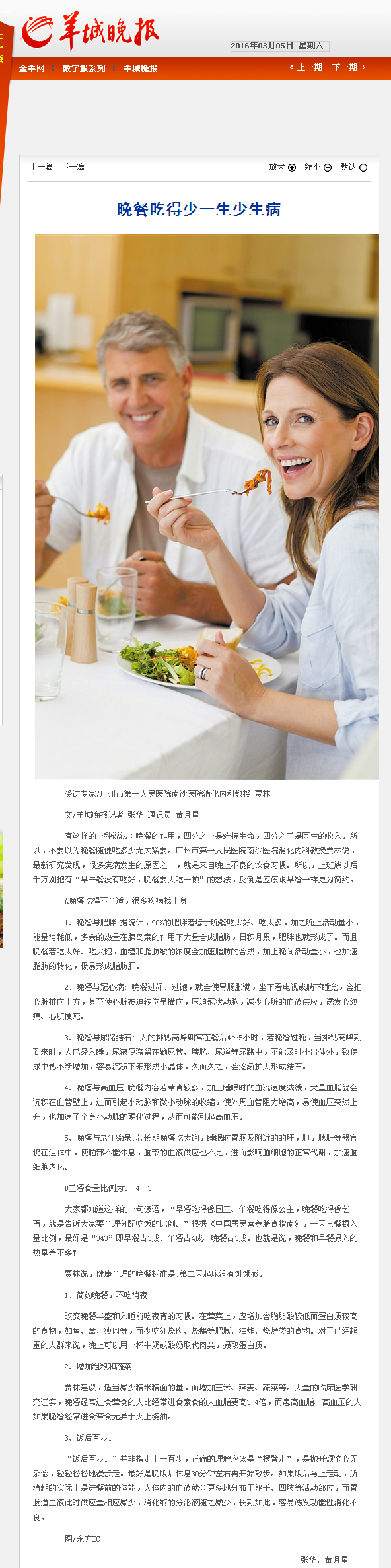 《羊城晚报》:晚餐吃得少一生少生病 2016年3月5日B8版