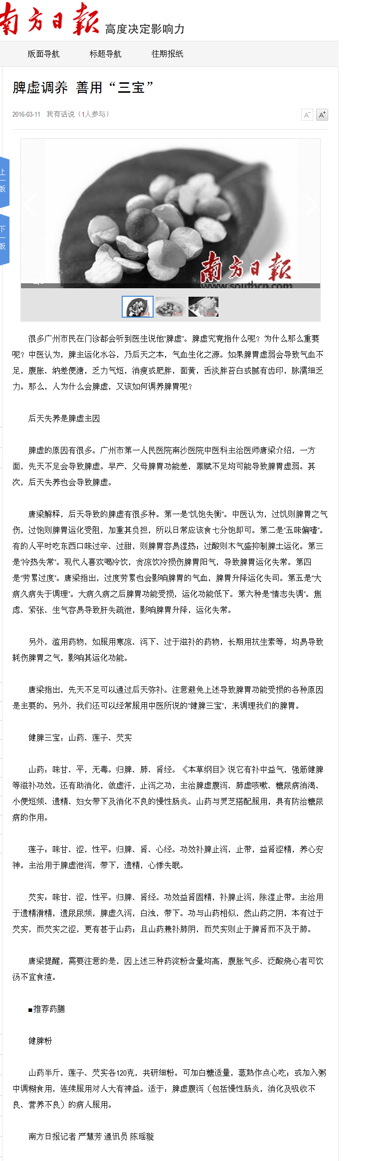《南方日报》:脾虚调养 善用“三宝” 2016年3月11日A25版