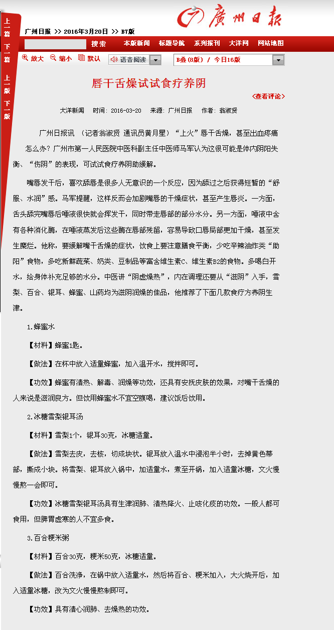 《广州日报》:辰干舌燥试试食疗养阴 2016年3月20日B7版