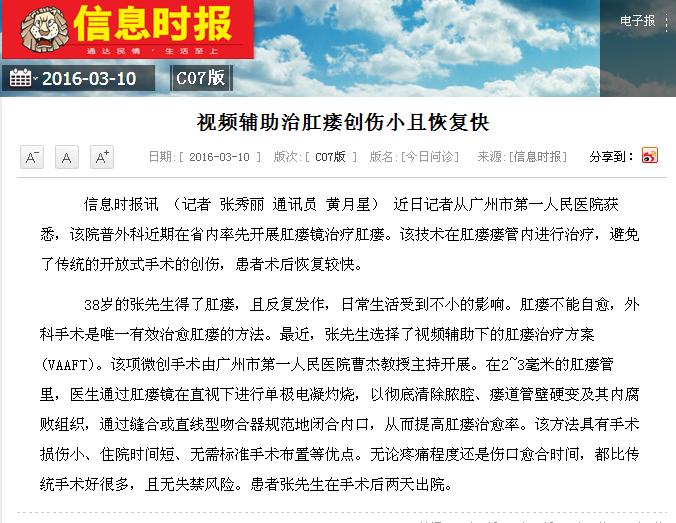 《信息时报》:视频辅助治肛瘘创伤小且恢复快 2016年3月10日C07版