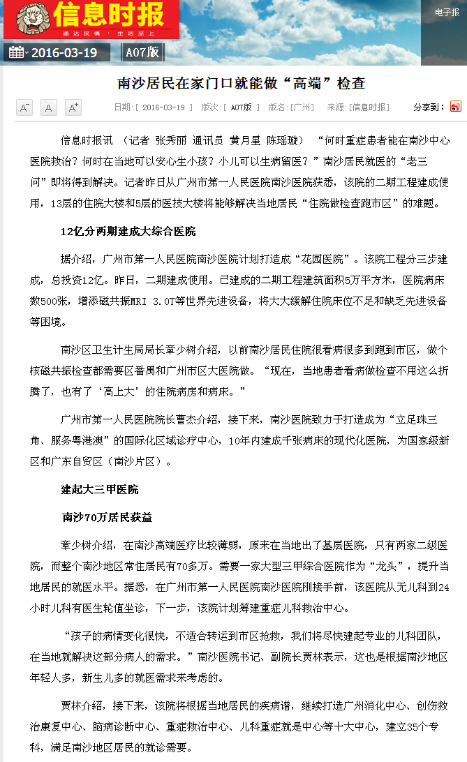 《信息时报》:南沙居民在家门口就能做“高端”检查 2016年3月19日A07版