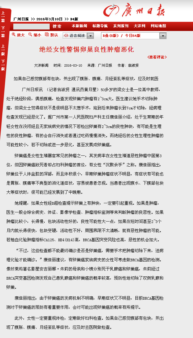 《广州日报》:绝经女性警惕卵巢良性肿瘤恶化 2016年3月10日B4版