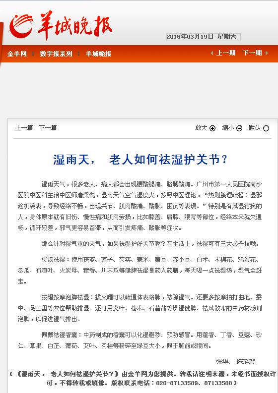 《羊城晚报》:湿雨天,老人如何祛湿护关节? 2016年3月19日B8版